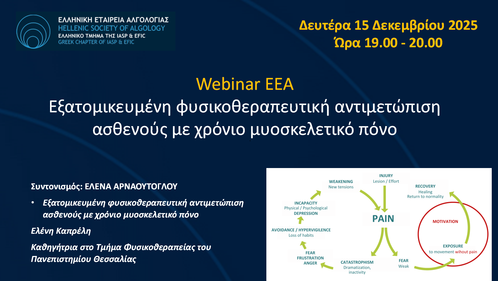 Η εξατομικευμένη αποκατάσταση αποτελεί το «κλειδί» για την αποτελεσματική διαχείριση του χρόνιου μυοσκελετικού πόνου. Στο webinar αυτό θα παρουσιαστούν περιπτωσιακές μελέτες, μέσα από τις οποίες θα αναδειχθεί πώς η συστηματική αξιολόγηση και η αναγνώριση του φαινοτύπου πόνου και των συνοδών συμπτωμάτων κάθε ασθενούς οδηγούν σε στοχευμένες παρεμβάσεις. Οι συμμετέχοντες θα έχουν την ευκαιρία να δουν στην πράξη πώς ο φυσικοθεραπευτής μπορεί να σχεδιάσει εξατομικευμένα πλάνα θεραπείας, που συνδυάζουν ερευνητικά τεκμηριωμένες σύγχρονες τεχνικές, θεραπευτική άσκηση και στρατηγικές αυτοδιαχείρισης, με στόχο τη βελτίωση της λειτουργικότητας και της ποιότητας ζωής των ασθενών.